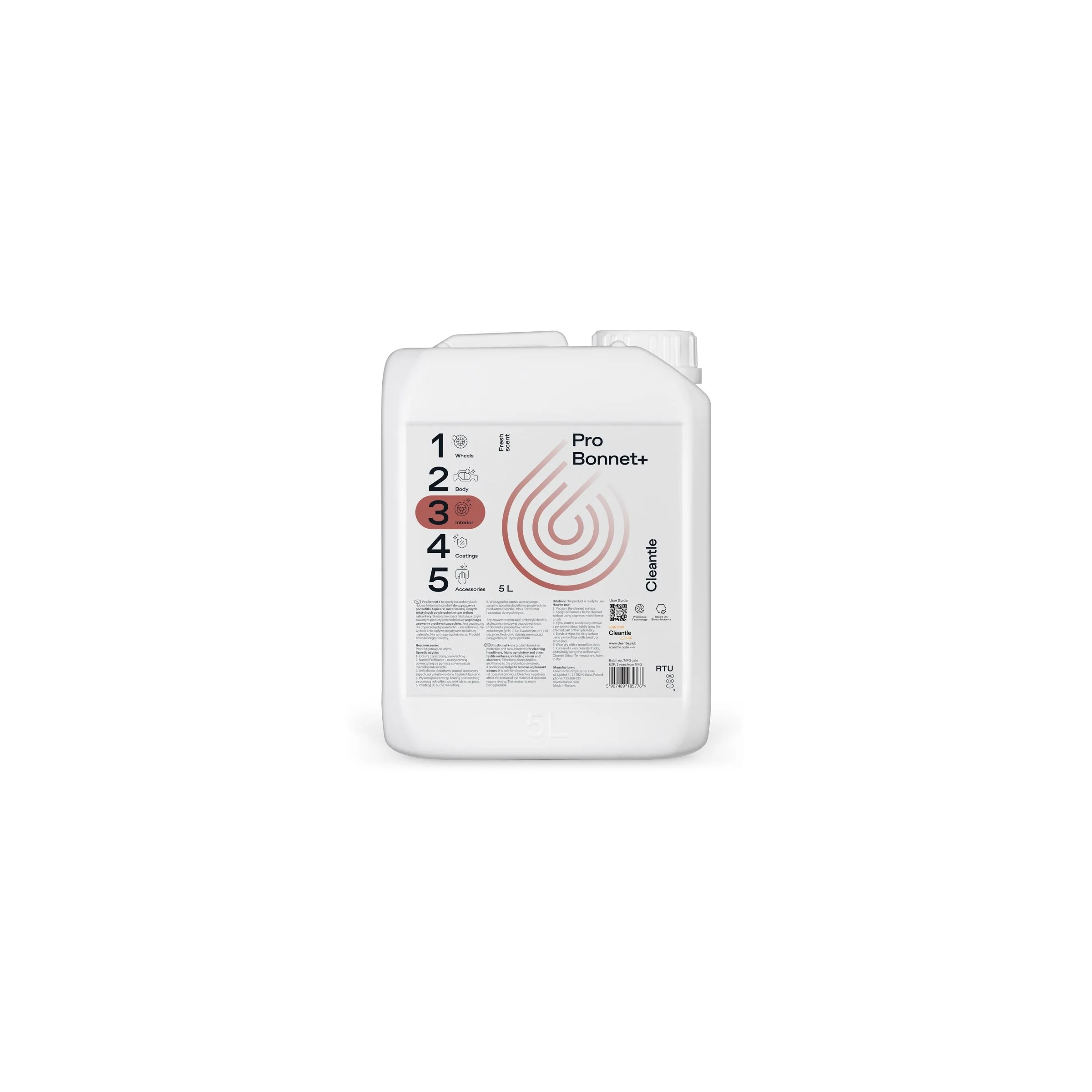Pro Bonnet+ to gotowy do użycia środek 2w1 do czyszczenia tapicerki, podsufitki i innych powierzchni tekstylnych w samochodzie. Skutecznie usuwa zabrudzenia oraz eliminuje nieprzyjemne zapachy dzięki formule opartej na probiotykach i biosurfaktantach. Nie wymaga wypłukiwania, jest bezpieczny dla weluru i alcantary oraz idealny do szybkiego odświeżenia wnętrza auta.