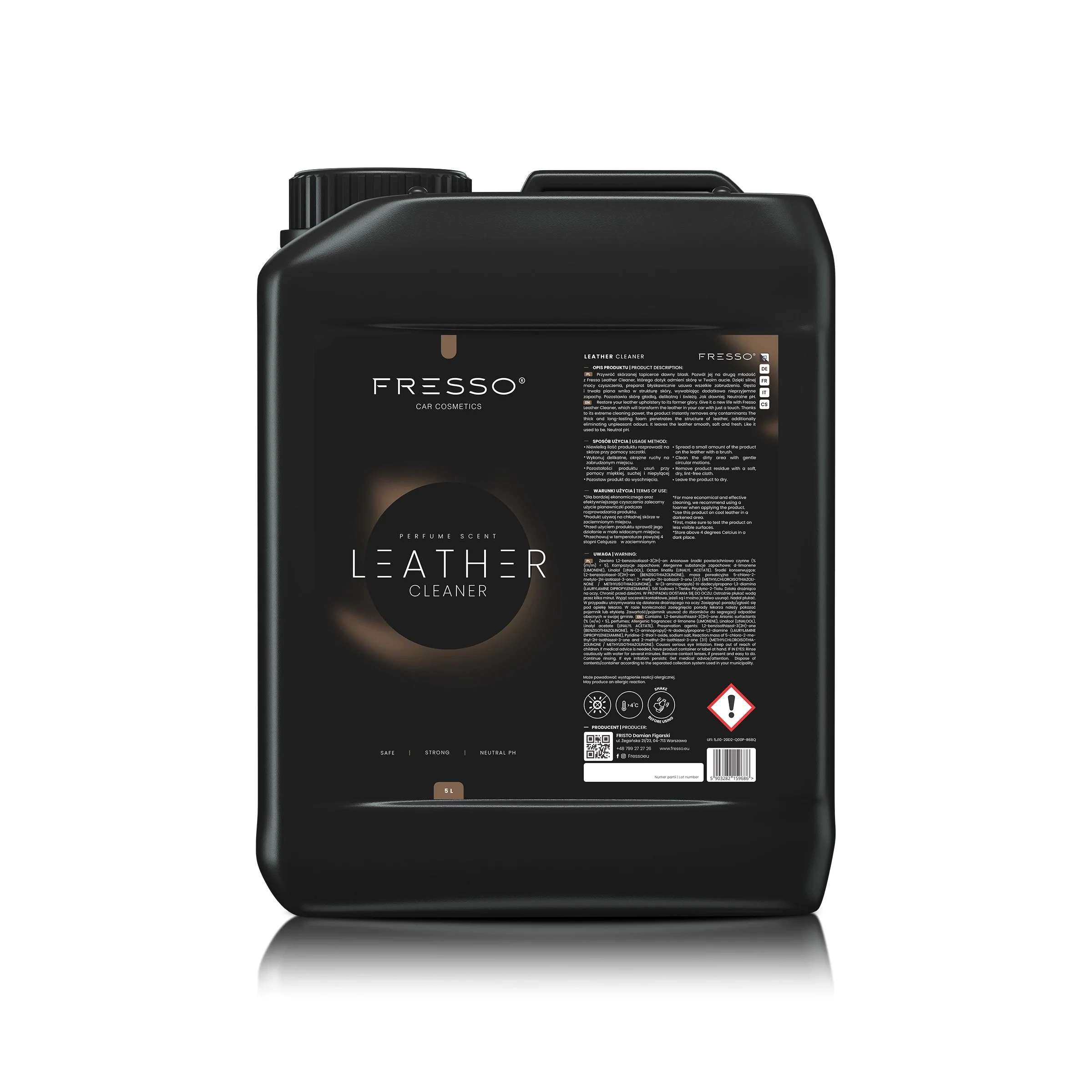 Przywróć skórzanej tapicerce dawny blask. Pozwól jej na drugą młodość z Fresso Leather Cleaner, którego dotyk odmieni skórę w Twoim aucie. Dzięki silnej mocy czyszczenia, preparat błyskawicznie usuwa wszelkie zabrudzenia. Gęsta i trwała piana wnika w strukturę skóry, usuwając dodatkowo nieprzyjemne zapachy. Pozostawia skórę gładką, delikatną i świeżą. Jak dawniej. Poczuj wyjątkowy zapach, który produkt pozostawia na jej powierzchni. Neutralne pH.